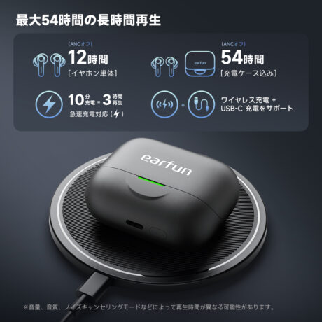 イヤホン単体の再生時間は最大12時間。充電ケースと併用すると、総再生時間は最大54時間に達します。急速充電に対応し、わずか10分の充電で3時間の再生が可能です。充電ケースはワイヤレス充電とUSB-C充電の両方をサポートしています。また、EarFun Air Pro 4+ はマルチポイント接続をサポートしており、最大 2 台のデバイスを同時に接続できます。PCで音楽を聴きながら、スマホの着信をスマートに切り替え。LDAC接続時でもマルチポイント接続可能。 ※LDACとマルチポイント接続を同時に有効にすると、音が途切れる場合があります。