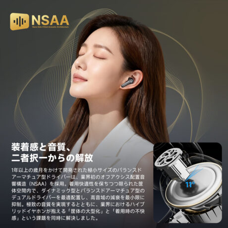 ・業界初のオフアクシス配置音響構造(Nano Side Fitted Acoustic Architecture 、NSAA™技術)で低音は力強く、中高音はクリアに、全帯域で自然につながる立体音場を実現。