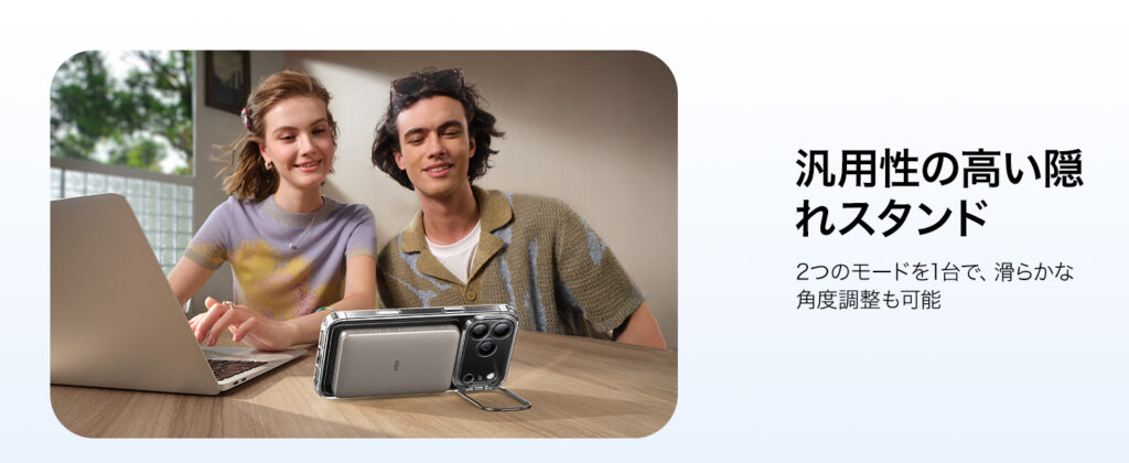 「スタンドケース、便利だけど邪魔じゃない?」いいえ、このスタンドは隠蔽式です!必要な時だけに出し、縦位置・横位置を自由自在に調整可能で、YouTube視聴はもちろん、TikTokやInstagramの縦長動画のライブ配信にも最適です。この独創的なデザインは、フレンチデザインアワード2024ゴールド賞を受賞しました!スタンドを使いながら同時にMagSafe充電もでき、革命的な便利さです