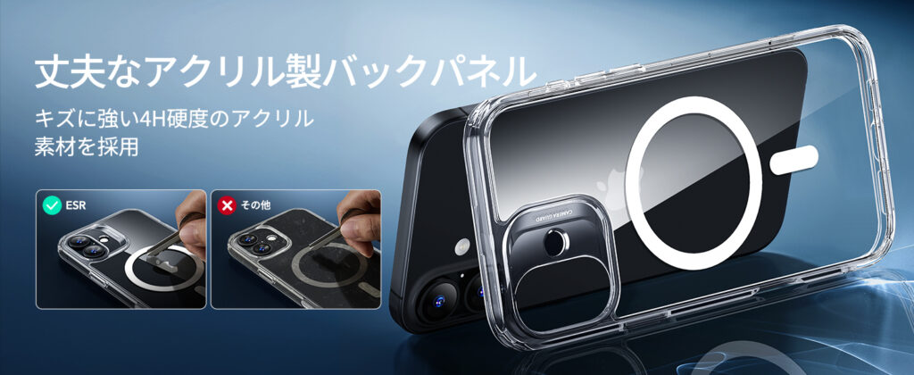 高純度アクリル素材が、iPhoneの洗練されたデザインラインとカラーを完璧に映し出すクリアさを実現します。さらに嬉しい「透明」の魅力として、ケース背面と本体の間にオリジナルの写真やメモ、お気に入りのシールを挟めるデザインに、思い出やこだわりのアイテムを透かして見せれば、世界でひとつだけのマイデザインに早変わります! 季節や気分で中身を入れ替えるだけで、手軽にオリジナリティを表現できます。軽量設計としっとりなめらかな手触りが、カスタマイズの楽しみと日常の使いやすさを両立させます