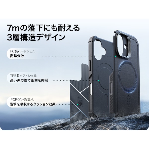 硬いTPEとPCのアウター部による3層構造は外側の衝撃や傷から保護し、クッション性の高いソフトなインナー部は内側の衝撃吸収を行い、最大約 7メートルの高さからの落下からもスマホを守ります。