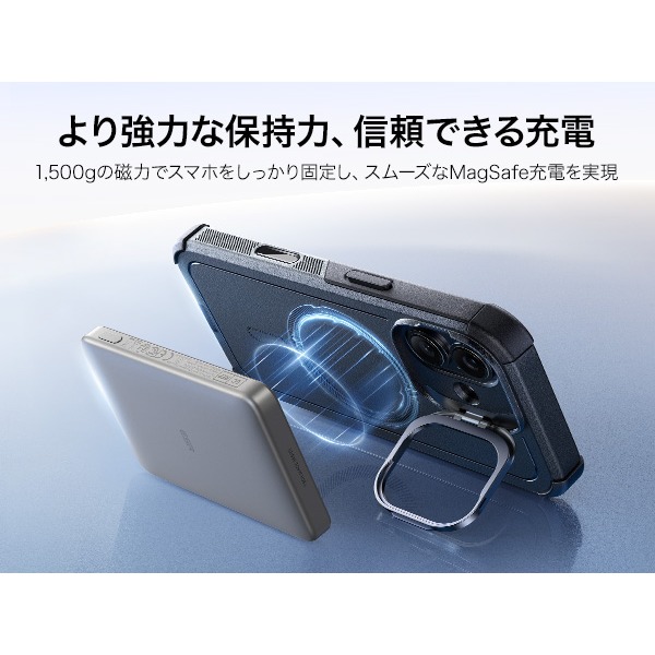 1,500gの保持力を持つ強力な内蔵マグネットが、より速く、より簡単な瞬間吸着ワイヤレス充電と、あらゆるMagSafeアクセサリーへの安全な磁気吸着固定を可能にします。