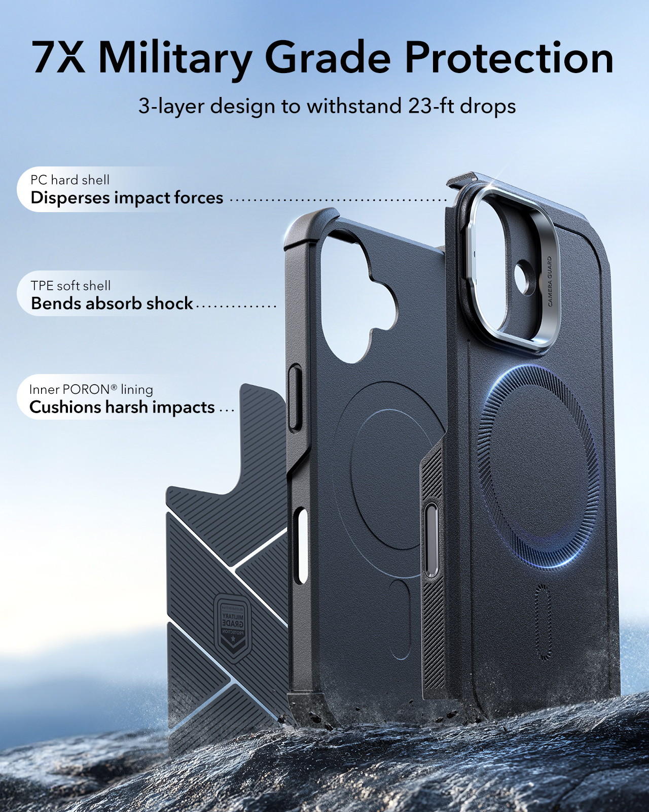 硬いTPEとPCのアウター部による3層構造は外側の衝撃や傷から保護し、クッション性の高いソフトなインナー部は内側の衝撃吸収を行い、最大約 7メートルの高さからの落下からもスマホを守ります。