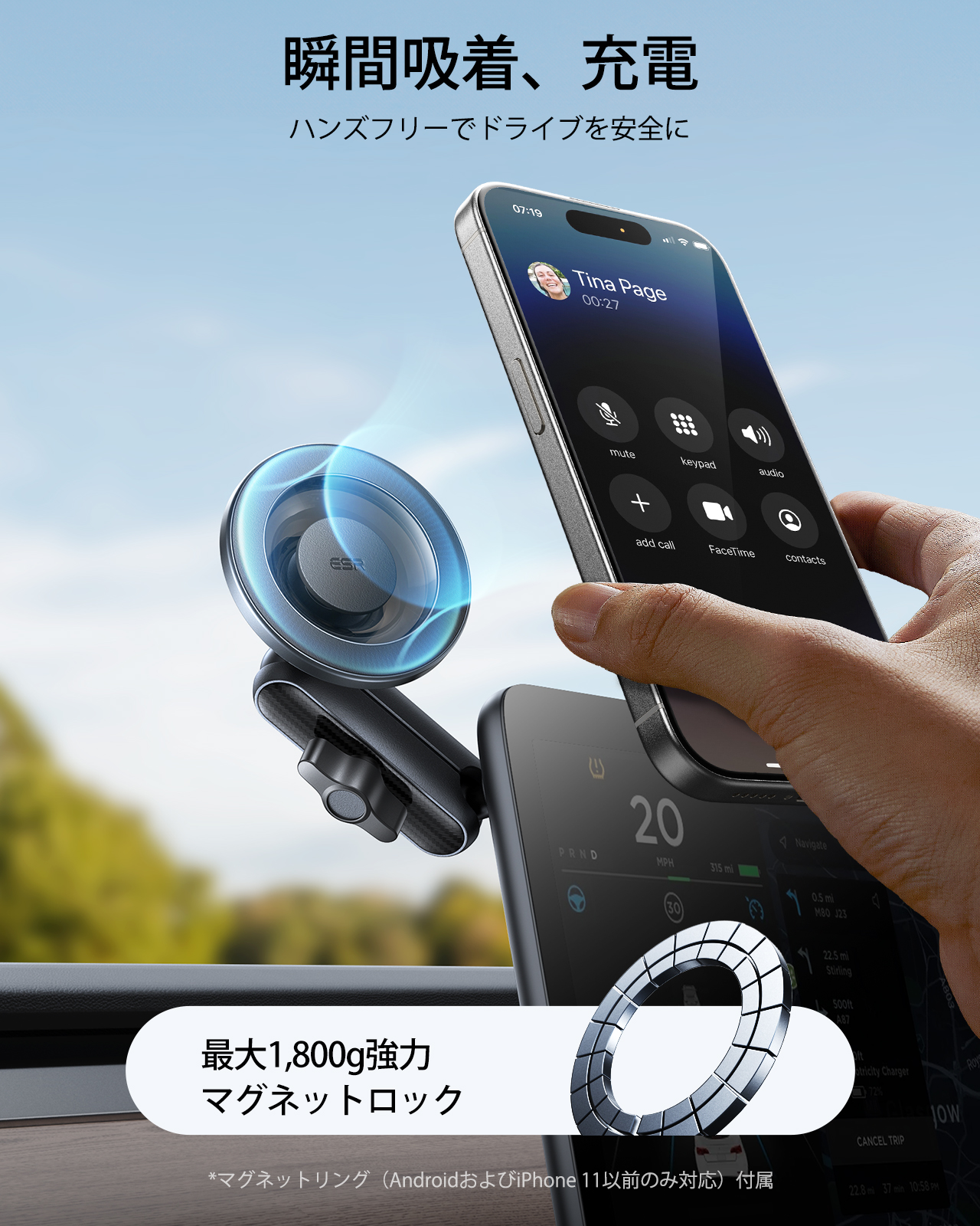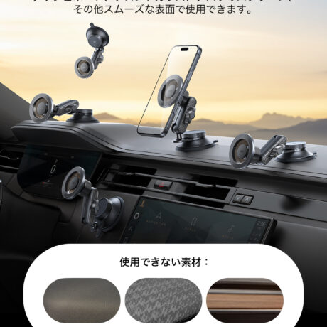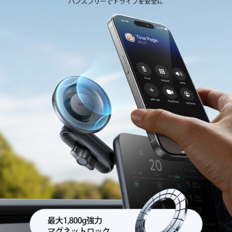 このマグネット式スマホ車載ホルダーは、20個の強力なN52磁石を使用しており、磁力は1,800gです。さらにESRのMagSafeケース使用時には2,100g、付属のマグネットリング使用時には3,750gまでアップします。この強力な磁力ででこぼこ道でもしっかりスマホを固定しつつ、通話やナビの電波を妨げることもありません。スマホをカチッと装着するだけで、ハンズフリーでの快適な画面操作やナビ利用が可能です。