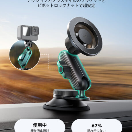 【安定したポジショニングで揺れを大幅減少】: カメラ用のアクションブラケットを応用したロックナット付きの角度調整機能で、お好みの角度にしっかり固定。3kgの減衰力を備え、競合製品の約3倍の安定感を誇り、完全ロックでずれを防止します。 ESRによる150回転/分の振動試験では、他の長腕タイプと比べて揺れを67%も低減した優れた性能を実証。 ※ワイヤレス充電には対応していません。※アダプター別売り