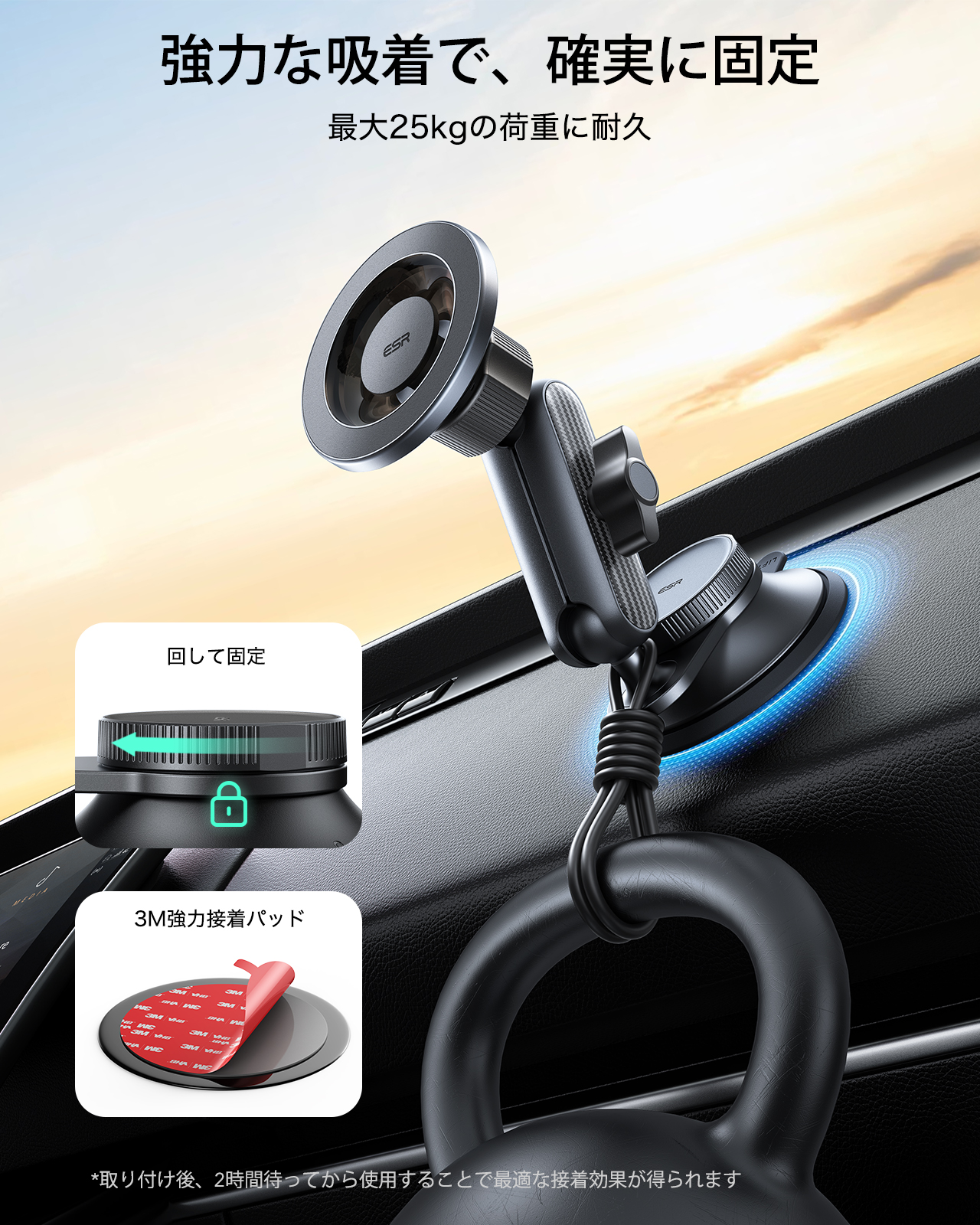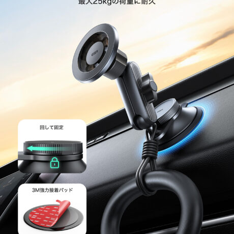 回転ロック式の吸盤を採用。ナノゲルコーティングを施した強力な吸盤は最大25kgの吸着力を誇り、高温(摂氏約85度)でも安定をキープします。