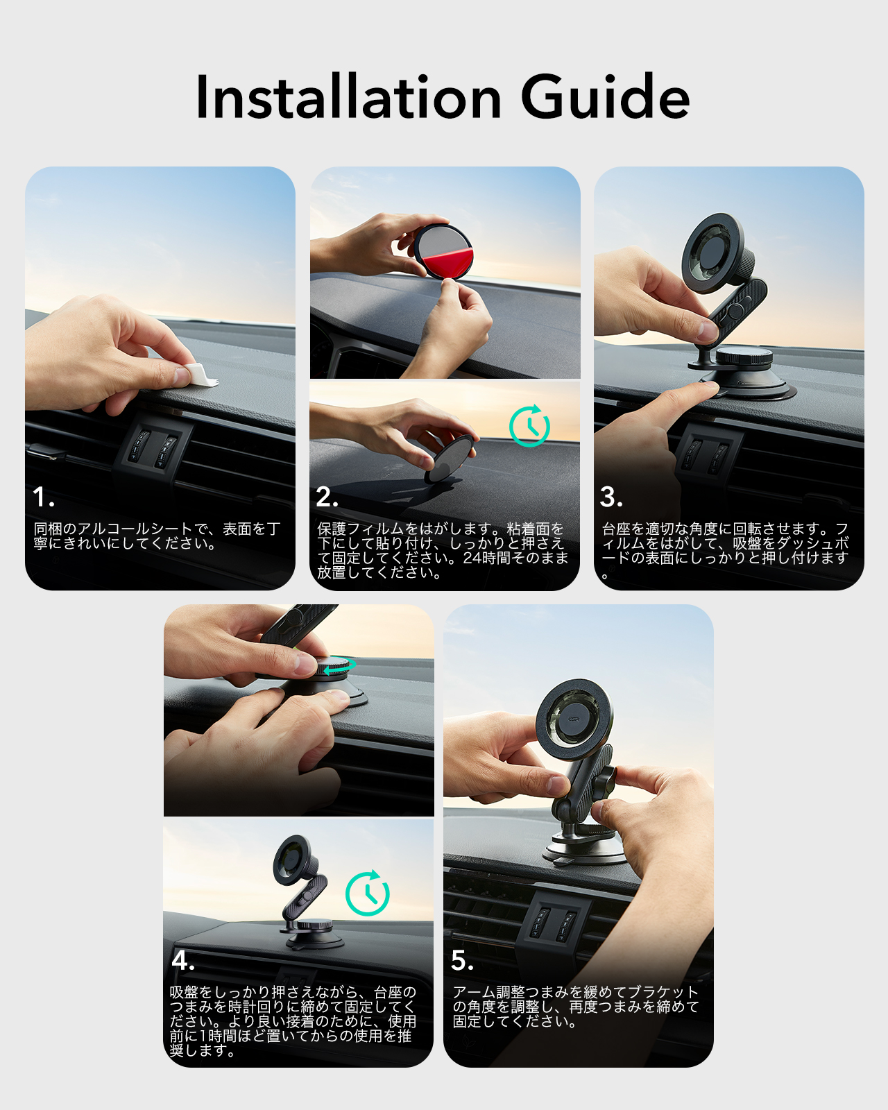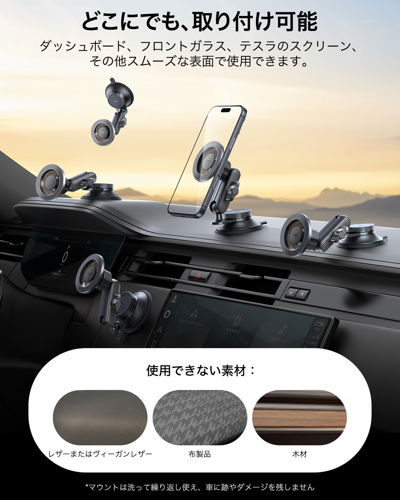 直径36cm²の丸型吸盤は、ダッシュボード、フロントガラス、センターコンソール、テスラの画面などの平面または緩やかな曲面にしっかり密着。吸盤は洗浄・再利用が可能で、跡が残らず車内を傷つけません。
