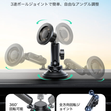 360度自在に回転するベースと3軸ボールジョイントを組み合わせ、あらゆる角度・方向に調整可能。最適な視野角でのスマホ操作が叶います。