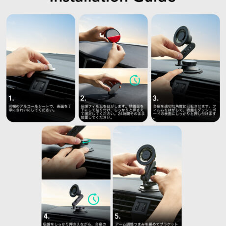 車載用スマホホルダー ×1 、磁気リング×2、 位置合わせガイド ×1、 取扱説明書 ×1、 アルコールシート ×2 、3M粘着剤 ×1