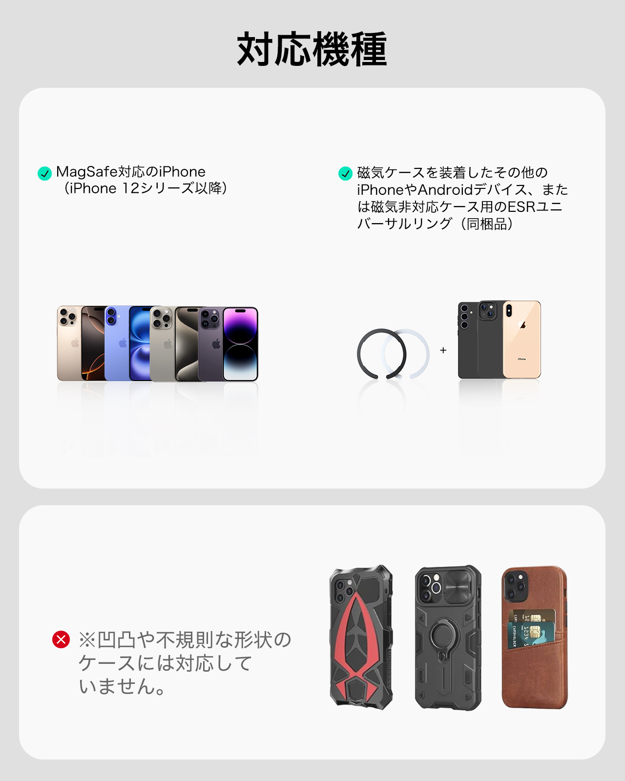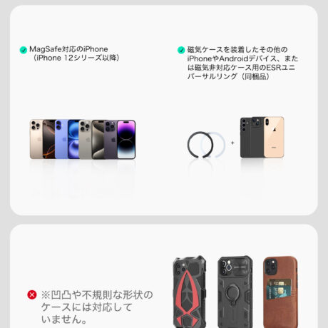 ※MagSafe非対応のスマホ・ケースでも付属の磁気リングを使えば利用可能です。