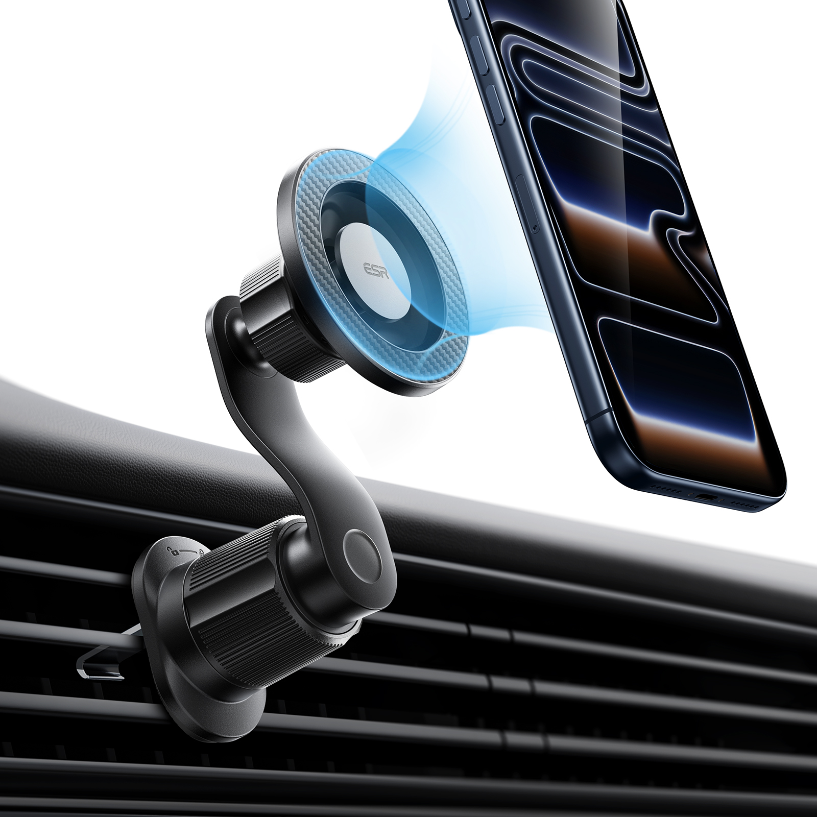 このマグネット式スマホ車載ホルダーは、20個の強力なN52磁石を使用しており、磁力は1,800gです。さらにESRのMagSafeケース使用時には2,100g、付属のマグネットリング使用時には3,750gまでアップします。この強力な磁力ででこぼこ道でもしっかりスマホを固定しつつ、通話やナビの電波を妨げることもありません。スマホをカチッと装着するだけで、ハンズフリーでの快適な画面操作やナビ利用が可能です。