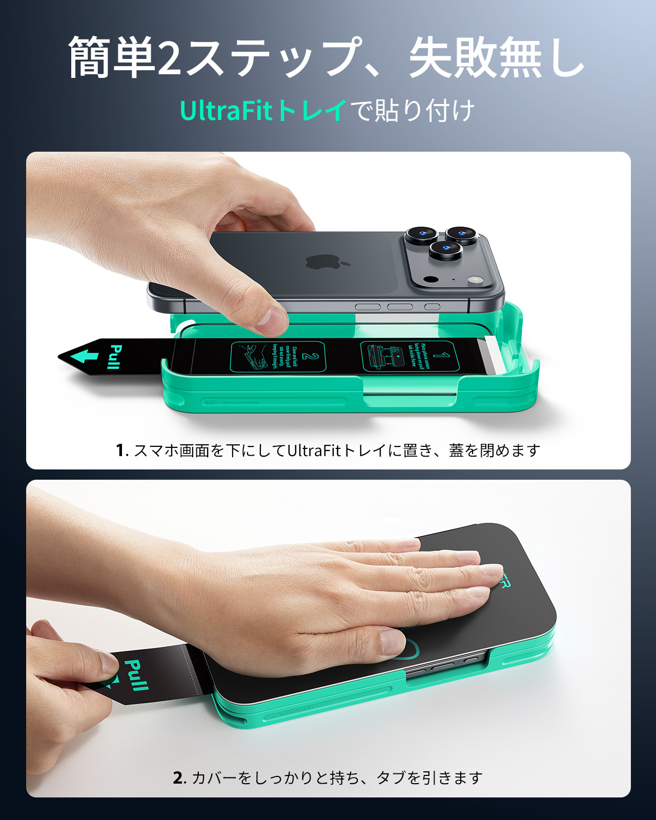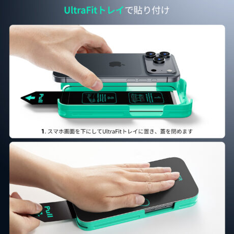 付属UltraFitトレイが正確な位置合わせを可能にし、ホコリ除去、静電吸着技術により、気泡・ホコリ混入のない簡単な取り付けがたったの数秒で行えます。