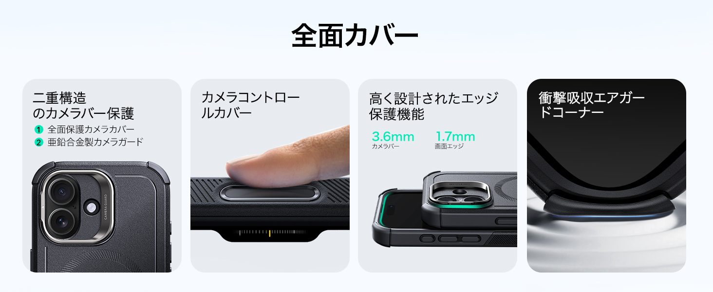 カメラレンズはスマホの命です!このiPhone17ケースはレンズ全体を覆うフルカバーと、丈夫な亜鉛合金製スタンドの二段構えで傷から徹底保護します。さらに周辺部よりわずかに高く設計されているため、置くときや落とした時の擦り傷やキズからもレンズを守ります。機能性と美しい一体感を実現したデザインです