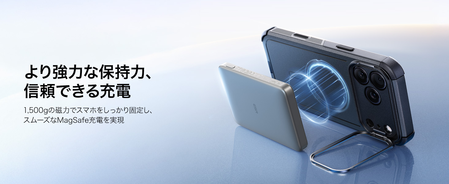 1,500gの保持力を持つ強力な内蔵マグネットが、より速く、より簡単な瞬間吸着ワイヤレス充電と、あらゆるMagSafeアクセサリーへの安全な磁気吸着固定を可能にします。